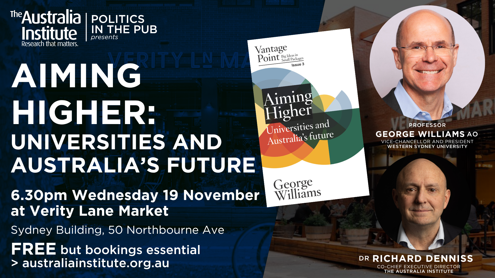 Copies of Aiming Higher: Universities and Australia’s future will also be available for purchase on the night or can be purchased online on The Australia Institute website.